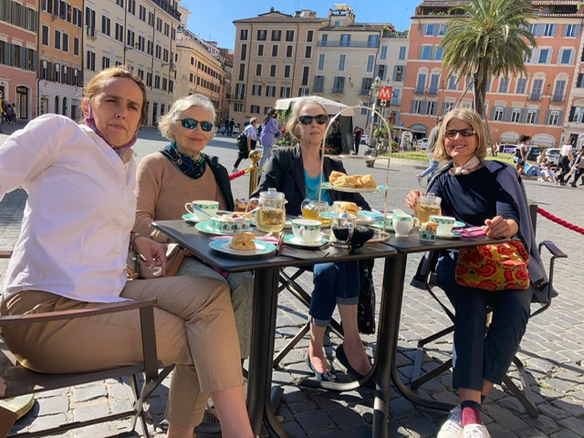 This was our view as we sat at the tables of Babington’s Tea Rooms last week. After many months of online Zoom activities, association members were finally able to meet in person, how joyful that was! Babington’s is certainly worth a visit, operating since 1893, they make cakes and scones to a supreme quality and their numerous blends will have something to please all tastes. Members enjoyed their brew with freshly made and toasted scones, topped with jam and whipped cream. It was wonderful being able to do something normal, catching up with friends whilst sipping tea under the magical afternoon Rome sun.