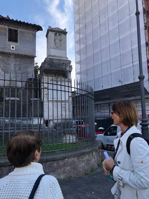 Walking slowly and chatting amicably to each other along the Aurelian wall to the ruins on Via Sulpicio Massimo, Silvia entertained us with the fascinating story of the small boy poet “Quinto Massimo Sulpicio”, who was represented by a very small statute known as the “Cippo”, discovered during the enlargement of the square of Porta Salaria in 1921. His story dates to 94 BC, at 11 years of age, Quinto was already a genius and took part in a Greek poetry contest. Many famous poets competed, but Quinto, who improvised 40 verses, no doubt astonished them all. He finished third among fifty-two competitors, arousing great admiration. Sadly, due to the strenuous mental effort, he subsequently became ill and died a few days after the competition.